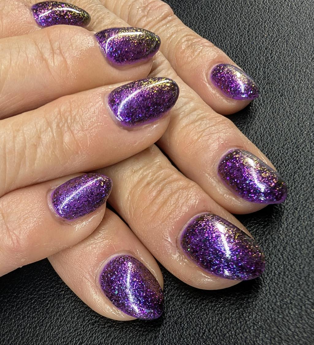 Hustler bursts with a deep, enigmatic purple, speckled with glints of vibrant pink, blue, and green, capturing the essence of a bustling cityscape at night. This multi-faceted hue offers a dynamic and bold look, perfect for those who carry a spirit of ambition and adventure. A captivating choice for making a strong, stylish statement.